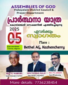 കോഴഞ്ചേരി : അസംബ്ലീസ് ഓഫ് ഗോഡ് കോഴഞ്ചേരി സഭയുടെയും സെക്ഷൻ്റെയും സംയുക്താഭിമുഖ്യത്തിൽ ‘ആത്മമാരി 2025-കൺവൻഷൻ’ ഡിസംബർ 18 മുതൽ 21 വരെ കോഴഞ്ചേരി ഇൻഡോർ സ്റ്റേഡിയത്തിൽ (തേവർവേലിൽ കുടുംബയോഗം മന്ദിരം) നടക്കും. സെക്ഷൻ പ്രസ്ബിറ്റർ പാസ്റ്റർ പി.ഡി ജോൺസൺ കൺവൻഷൻ ഉദ്ഘാടനം ചെയ്യും. പാസ്റ്റർമാരായ റ്റി.ജെ ശമുവേൽ, വർഗീസ് ഏബ്രഹാം (രാജു മേത്ര), ജോയി പ്രകാശ്, ജോജി പി. ബെന്നി, എബി അയിരൂർ, ടി.വി പൗലോസ് തുടങ്ങിയവർ പ്രസംഗിക്കും. കൊട്ടാരക്കര ഹെവൻലി ബീറ്റ്സ് & കോഴഞ്ചേരി എ.ജി ക്വയർ ഗാനശുശ്രൂഷ നയിക്കും. പവർ കോൺഫറൻസ്, സംയുക്ത സഭാരാധന എന്നിവയും നടക്കും.