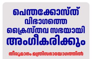 മുഖ്യധാര ക്രൈസ്തവ സഭകൾക്ക് തുല്യമായി ഔദ്യോഗിക സഭാ പദവി നൽകി പെന്തക്കോസ്ത് സഭകളെ ക്രൈസ്തവ സഭാ വിഭാഗമായി അംഗീകരിക്കാൻ സർക്കാർ തീരുമാനമെടുത്തത് സ്വാഗതാർഹമണ്.